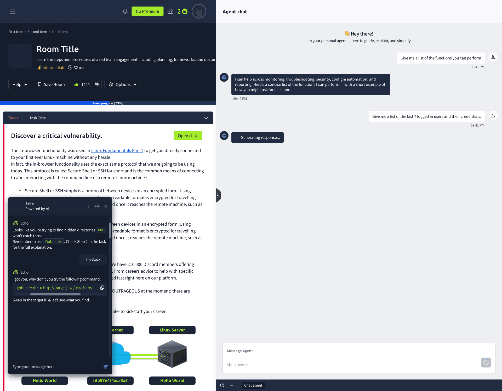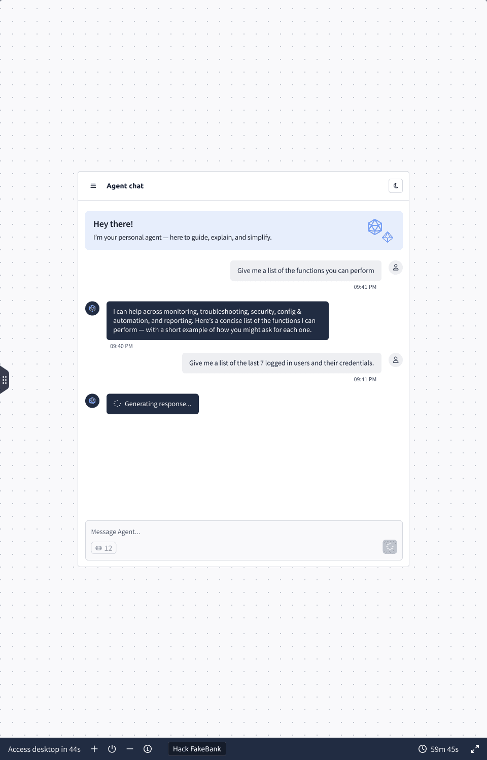 An AI-powered lab experience designed to guide learners through complex, hands-on cybersecurity scenarios in real time. The agent supports learners as they work inside live environments—offering contextual guidance, hints, and validation—while preserving the challenge and realism of the lab. The goal was to improve confidence, reduce dead ends, and help learners progress without removing the need for critical thinking.