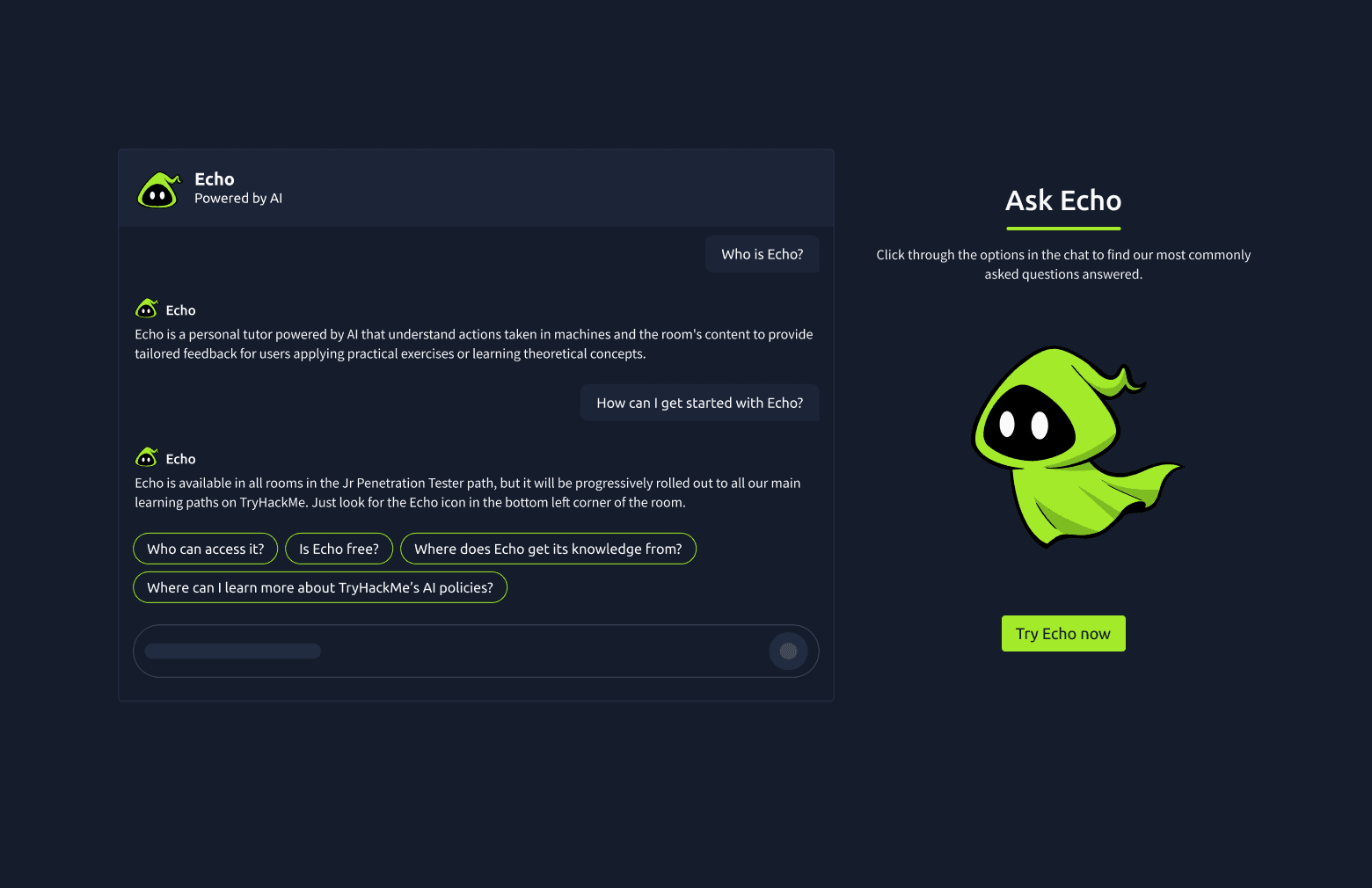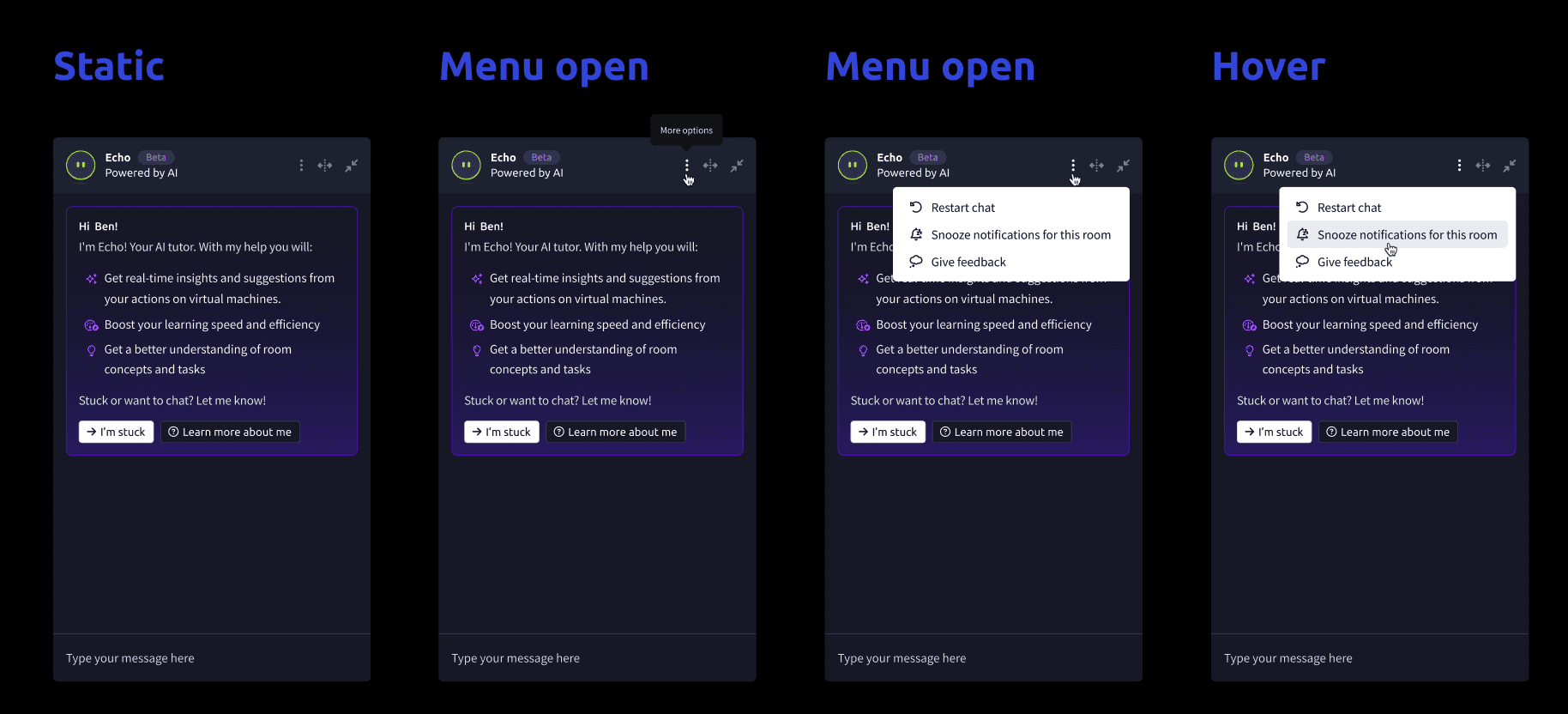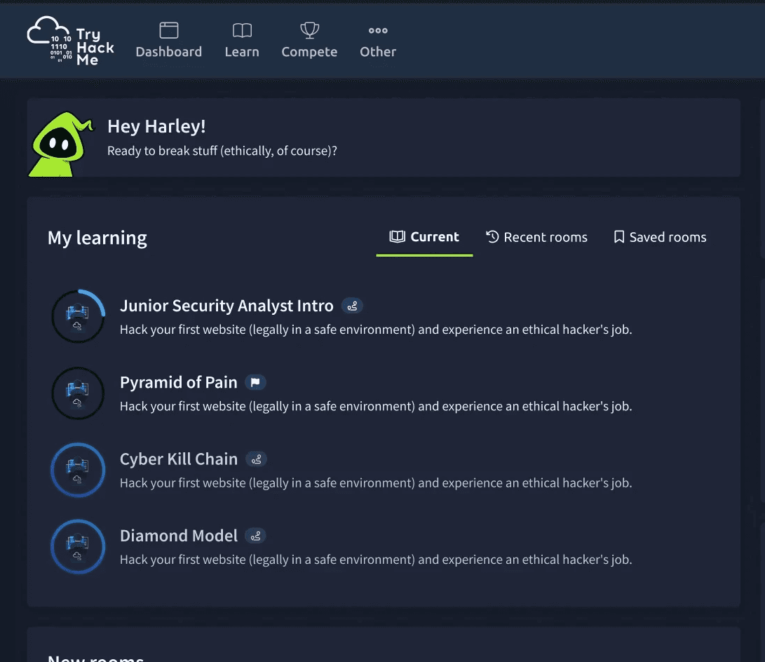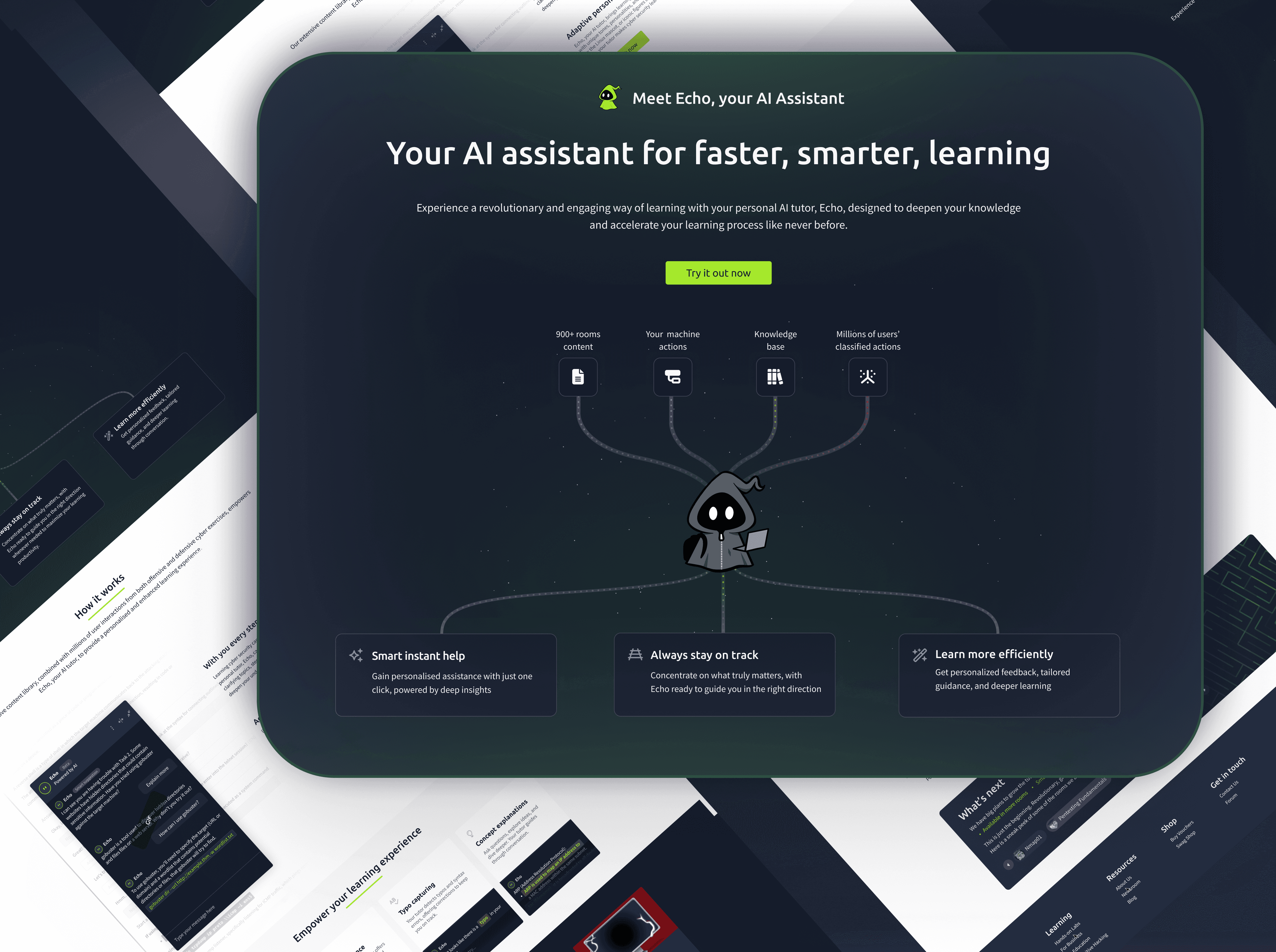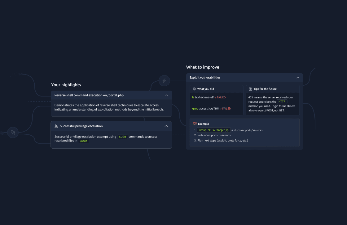 An AI-powered learning assistant designed for the learning platform TryHackMe guiding learners through complex cybersecurity content with clarity and confidence. The experience uses contextual nudges, adaptive feedback, and motivational prompts to reduce friction, keep learners on track, and improve engagement without overwhelming them. The goal was simple: make learning feel supported, not solitary.
