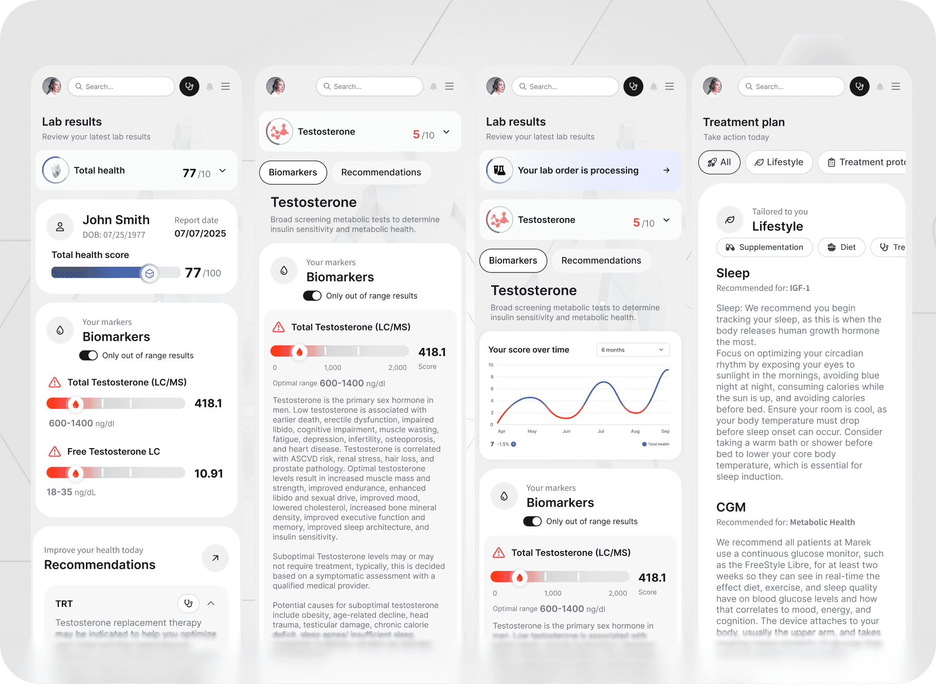 A patient-facing portal designed to centralize health insights, treatment plans, appointments, and recommendations into a unified experience. The platform bridges clinical guidance and everyday action, helping users move from diagnosis to sustained health management.