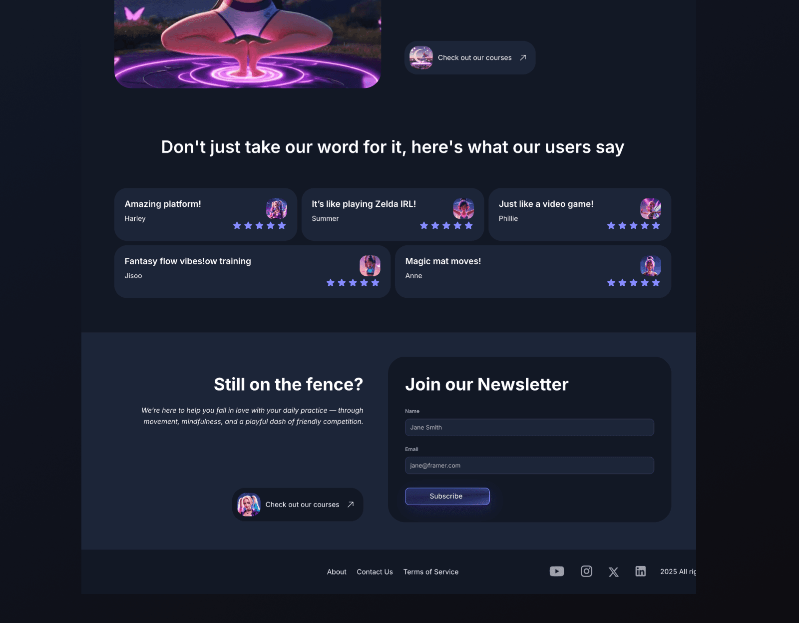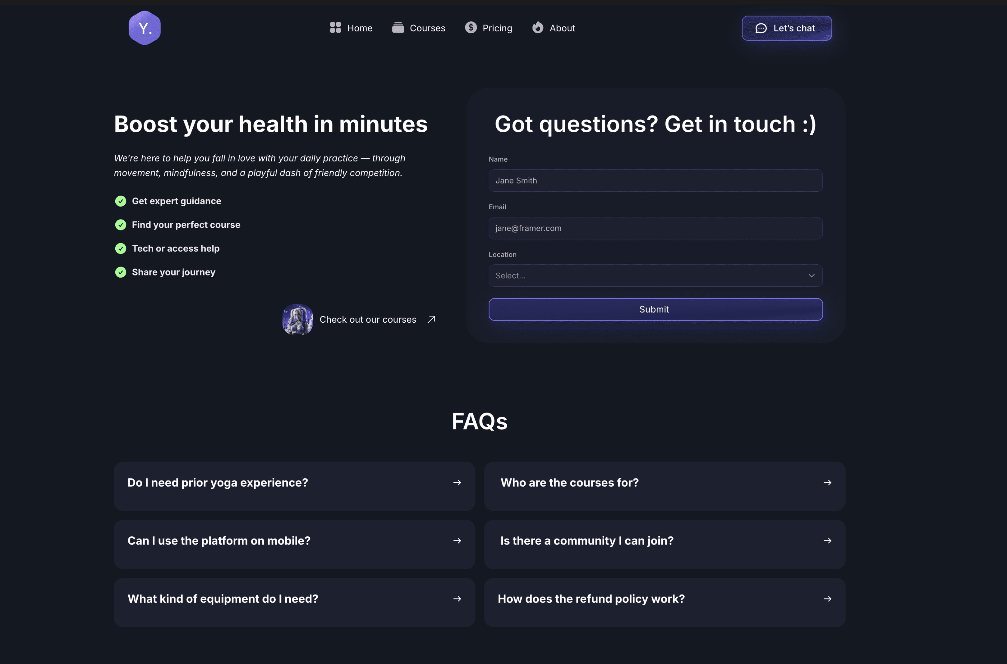 Yogify is a modern Framer website template designed for wellness brands, creators, and instructors looking to launch quickly without sacrificing visual quality. The template combines motion, clean typography, and modular sections to create a calm yet conversion-focused digital presence.